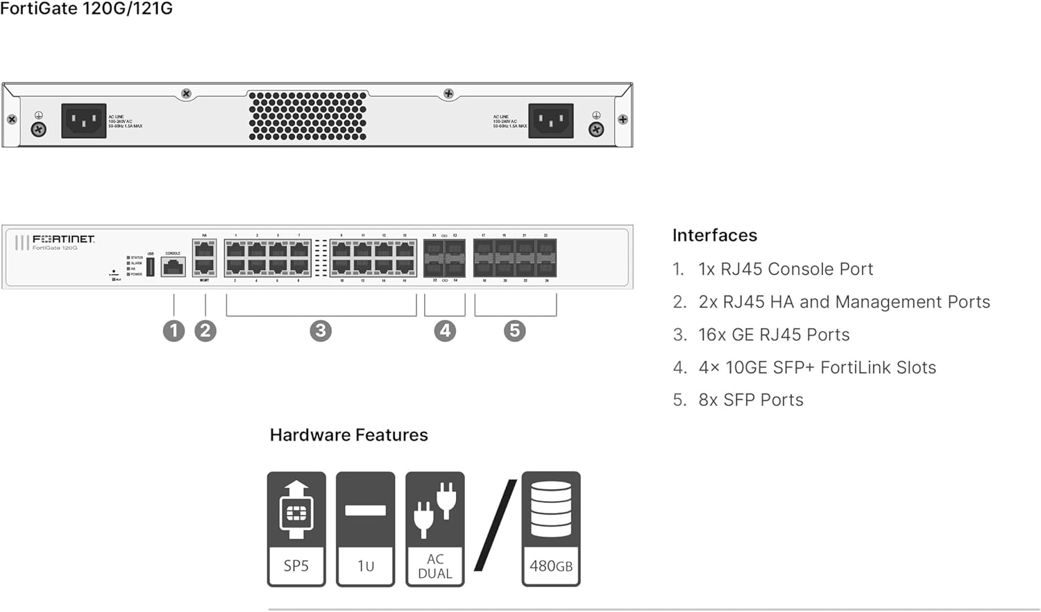 FortiGate-120G 18 x GE RJ45 ports (including 1 x MGMT port, 1 X HA port, 16 x switch ports), 8 x GE SFP slots, 4 x 10GE SFP+ slots, SP5 hardware accelerated, dual AC power supplies