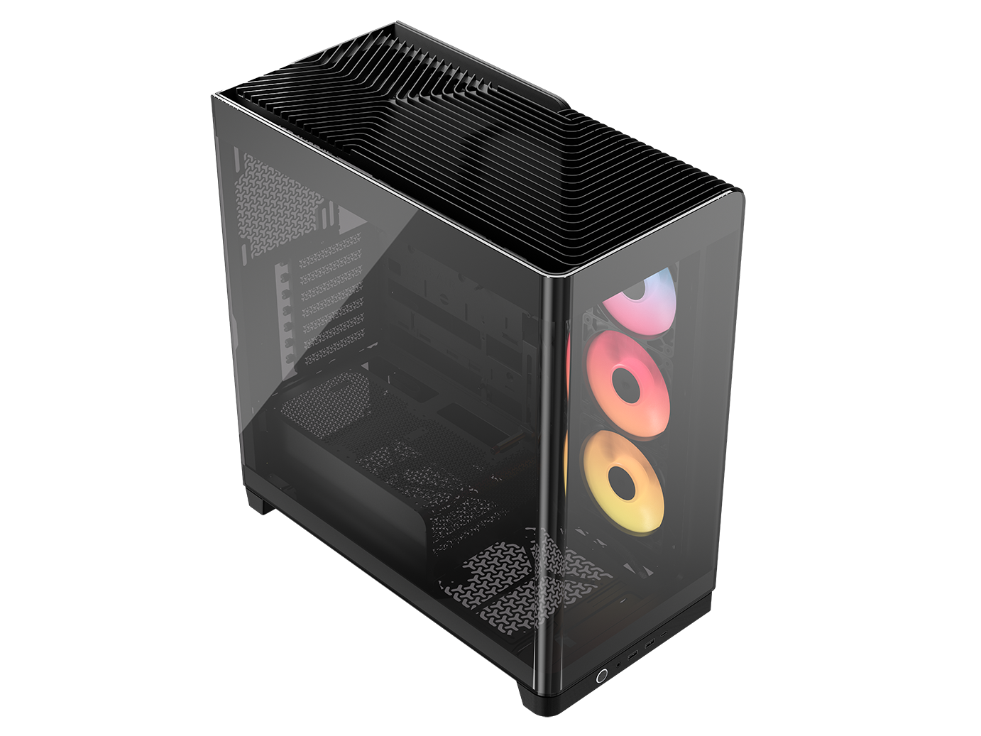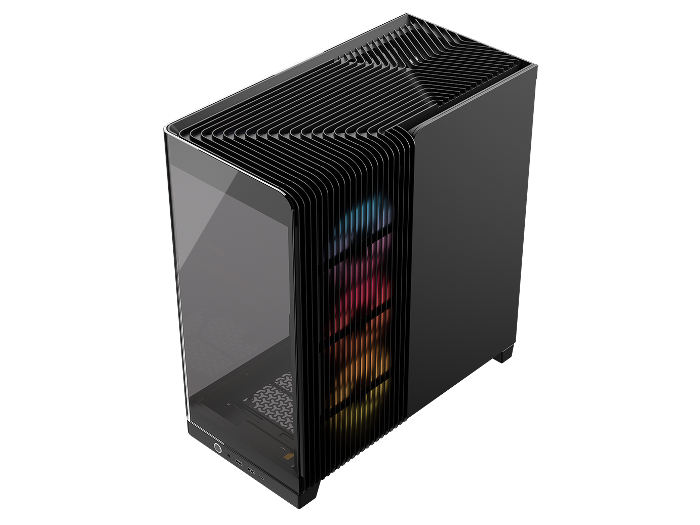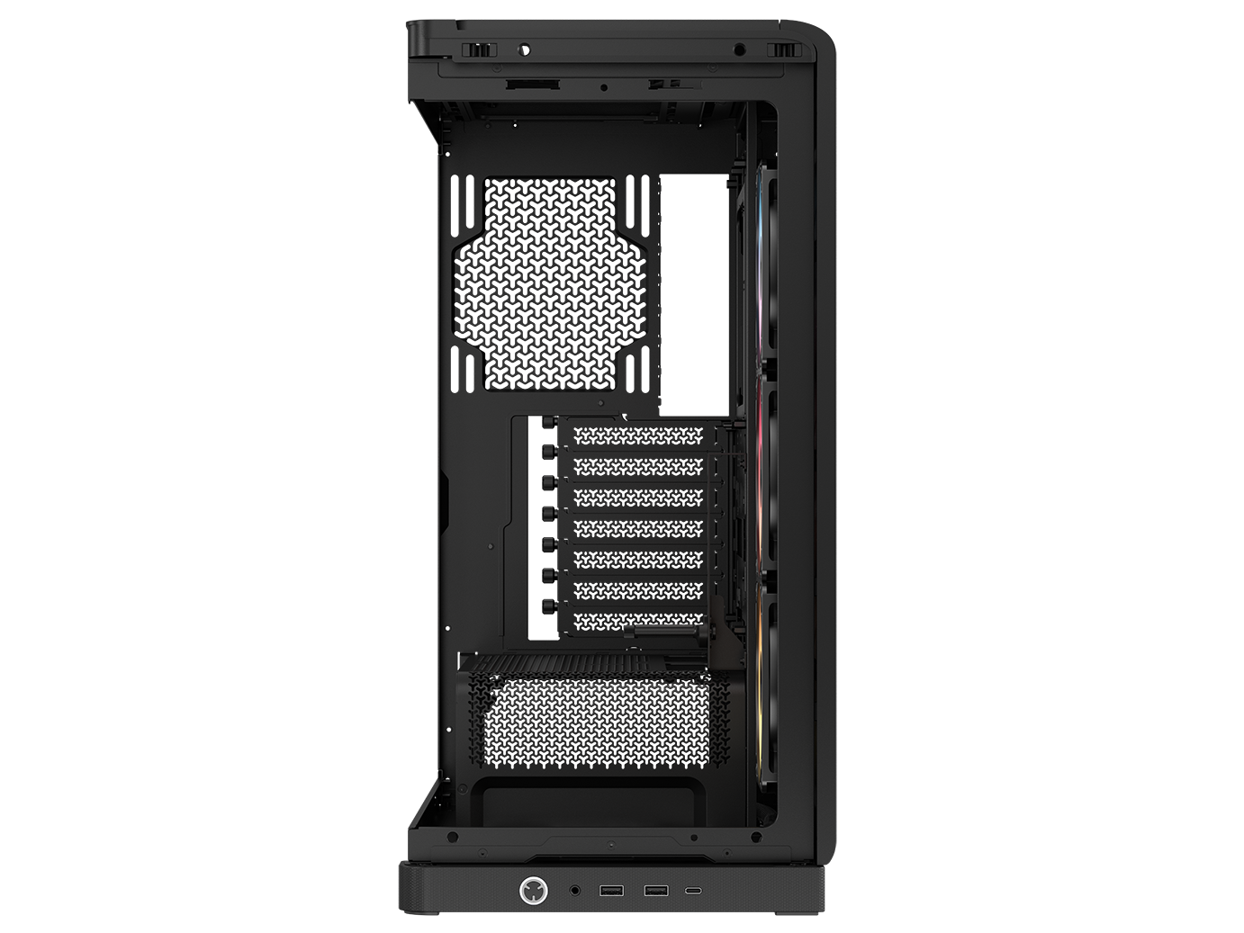 A single-piece wraparound glass panel combines with support for reverse-connector motherboards for flawless aesthetics,
